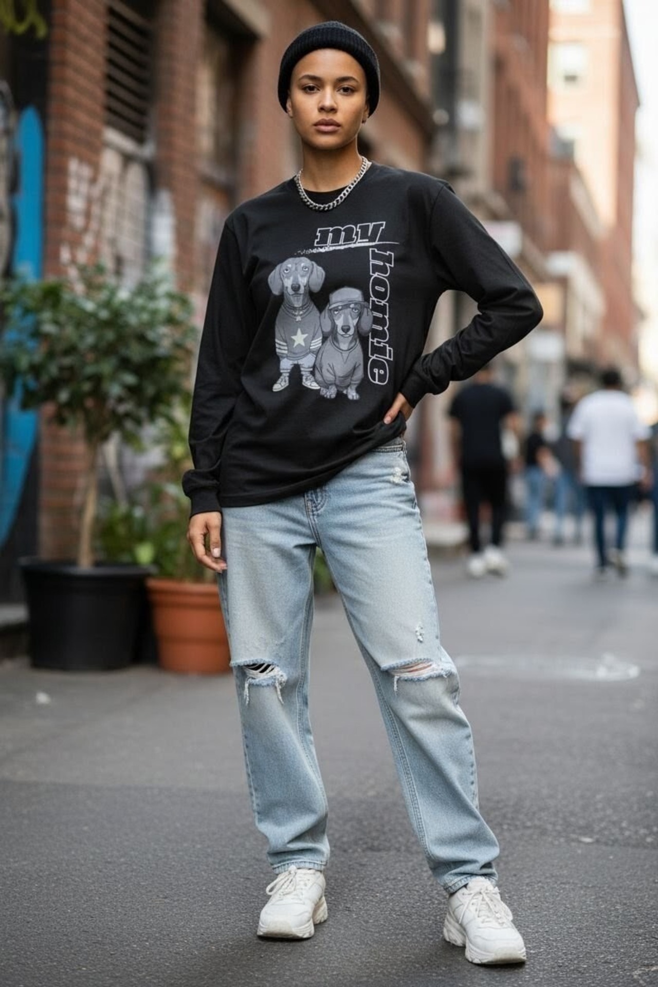 ストリートカルチャーの雰囲気を更にブラッシュアップさせるロングスリーブのボディと、モノクロで配されたプリントが相性抜群‼